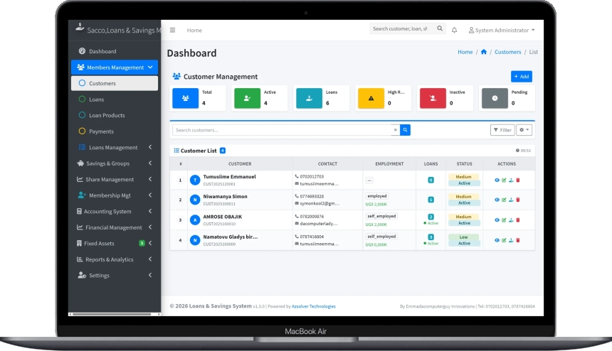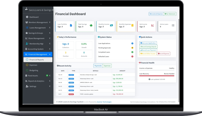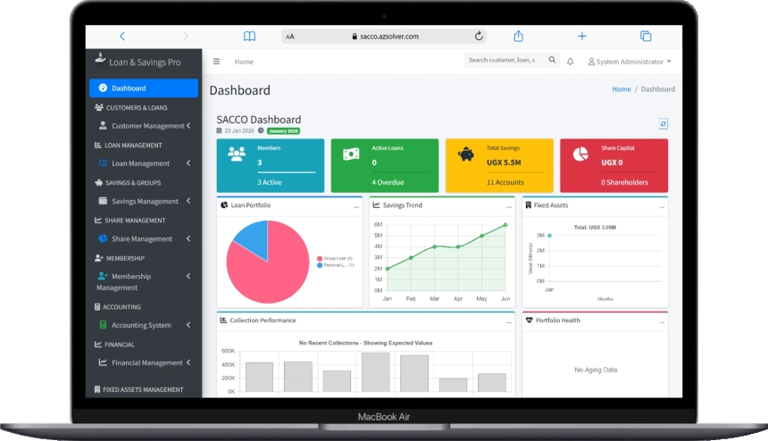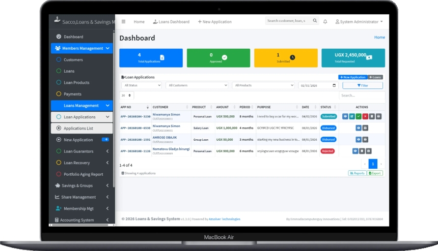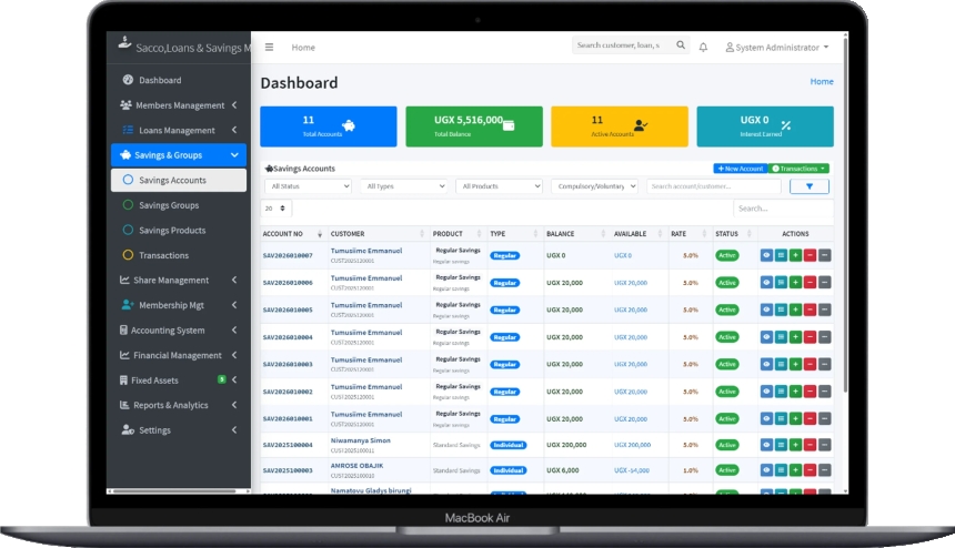 SACCO management system, SACCO software, microfinance management system, loans and savings system, SACCO ERP, cooperative management software, SACCO dashboard, loan management software, savings and credit cooperative system, Uganda SACCO software, Africa microfinance system, financial management system for SACCOs, SACCO accounting software, best SACCO system