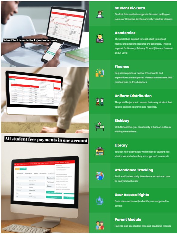 SchoolTool is a comprehensive web application designed to streamline and digitise various school processes in Uganda. The platform offers a range of modules tailored to meet the diverse needs of educational institutions, enhancing efficiency and promoting better planning.